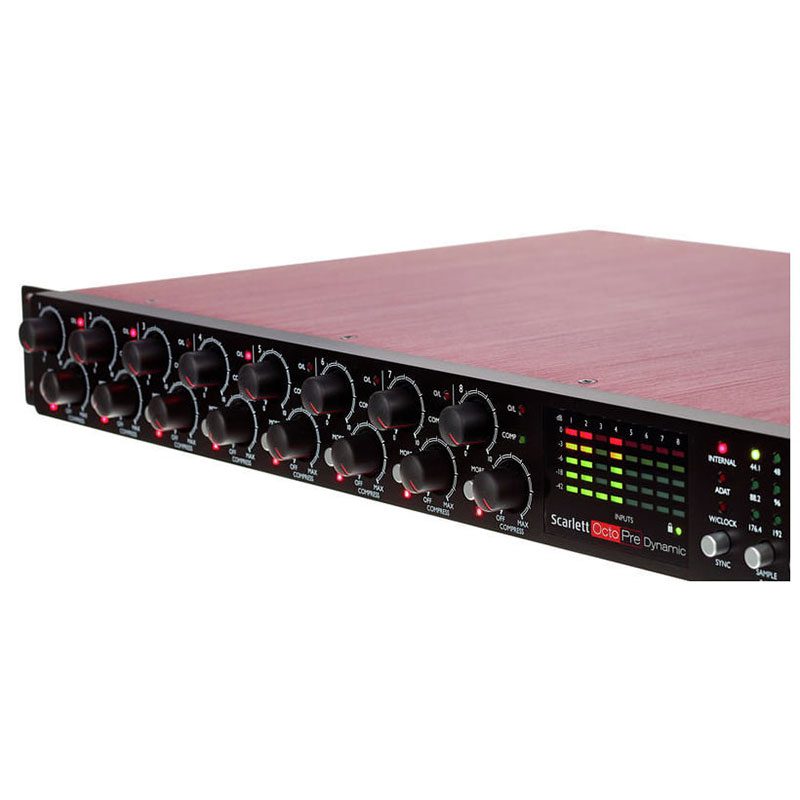 OctoPre Dynamic دارای هشت پری امپ line و میکرفون نسل دوم Focusrite می باشد که هدروم بالا، gainِ تمیز و زیاد، نویز کم و distortion ِ بسیار پایینی را به شما ارائه می دهد که این ویژگی ها برای ضبط کردن صدای درامز، گیتار، وکال و بسیاری صداهای دیگر ایده آل است. با استفاده از ورودی های ساز که در پنل جلویی قرار گرفته اند می توانید گیتار یا کیبوردهای خود را مستقیما به OctoPre Dynamic متصل کنید. ورودی/ خروجی های ADAT نیز قابلیت های اتصال زیادی را برای شما به ارمغان می آورند: با استفاده از این خروجی ها می توانید هر وسیله یا سیستم دیجیتالی که دارای ورودی های ADAT هستند را به OctoPre Dynamic متصل کنید.