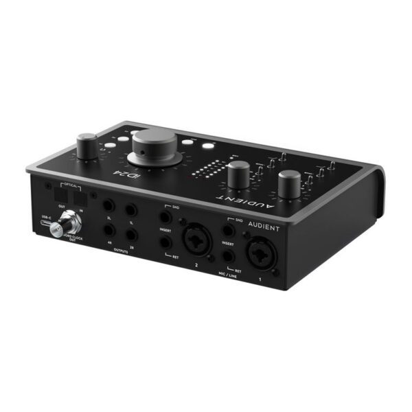 این کارت صدای USB-C با ده ورودی و چهارده خروجی، دارای دو پری امپ میکروفن کنسولی Audient، یک ورودی اینسترومنت JFET، چندین مبدل رده بالا، کانکشن ADAT و یک میکسر DSP می باشد. این کارت صدا دارای دو پری امپ میکروفن Class A است که در کنسول های Audient استفاده می شود؛ دقیقا همان پری امپی که در کنسول ضبط Audient ASP8024-HE وجود دارد؛ این مدار علاوه بر نویز و دیستورشن بسیار کم خود، کاراکتر صوتی آنالوگ را نیز چاشنی کار خود قرار می دهد. با گین 60 دسی بلی، شما می توانید از میکروفن های ribbon دلخواه خود برای ضبط صدای منابع صوتی که صدای آرامی دارند استفاده کنید. ورودی DI این محصول که بر اساس ورودی یک آمپلی فایر tube کلاسیک شبیه سازی شده، به ارتقا کیفیت صدای شما منجر می شود. اگر طرفدار کیفیت مدل iD44 هستید ولی آن همه ورودی/خروجی به کارتان نمی آید، iD24 بهترین گزینه برای شماست..