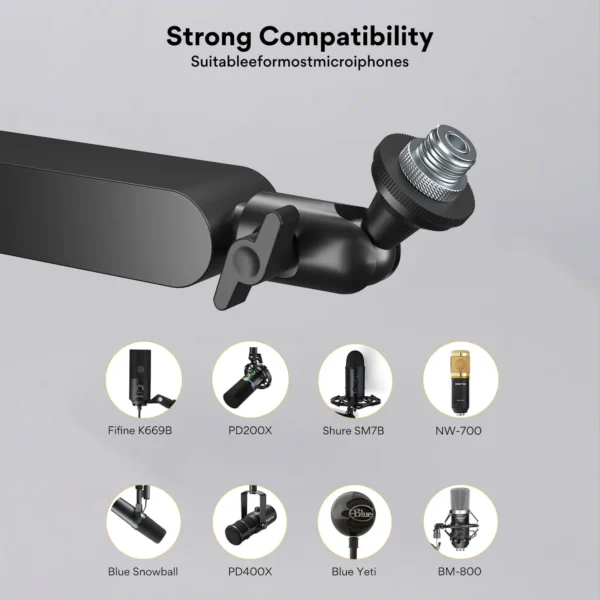 این پایه قابلیت اتصال به تمامی میکروفون های استودیویی و پادکست و گیمینگ را دارد و به راحتی بر روی میز کار شما نصب میگردد